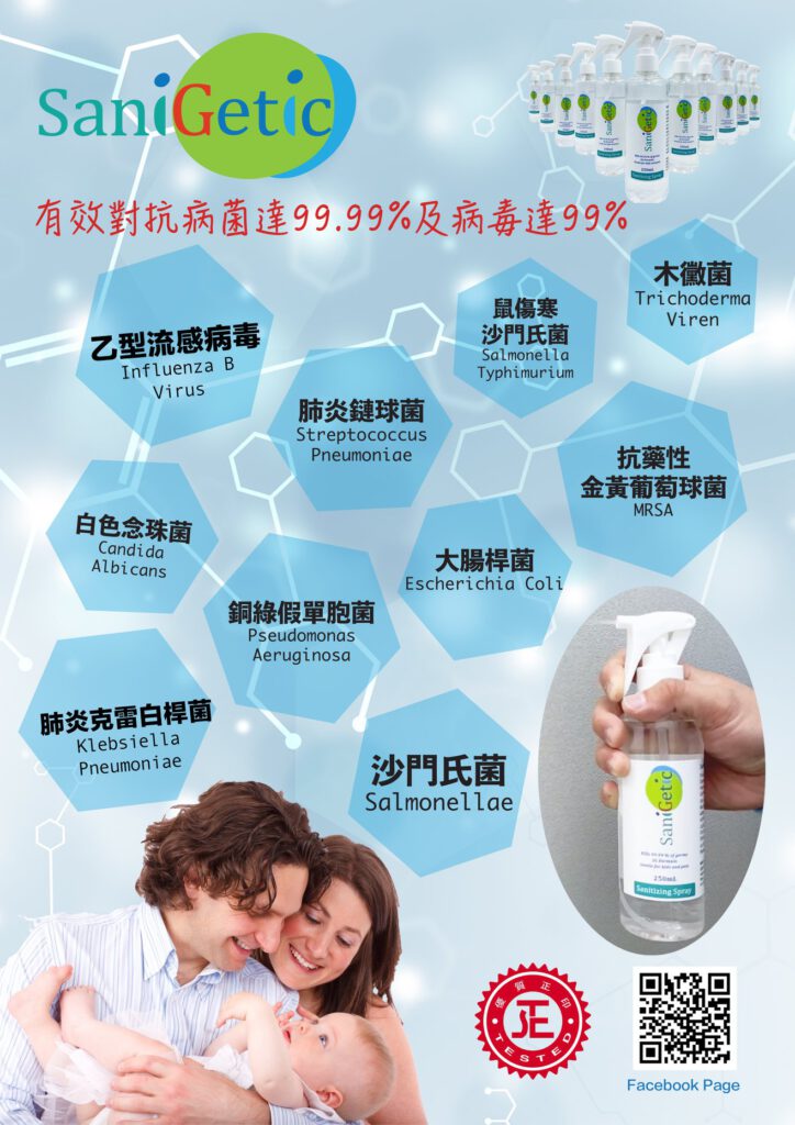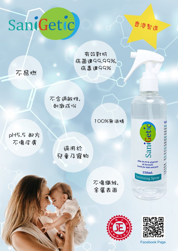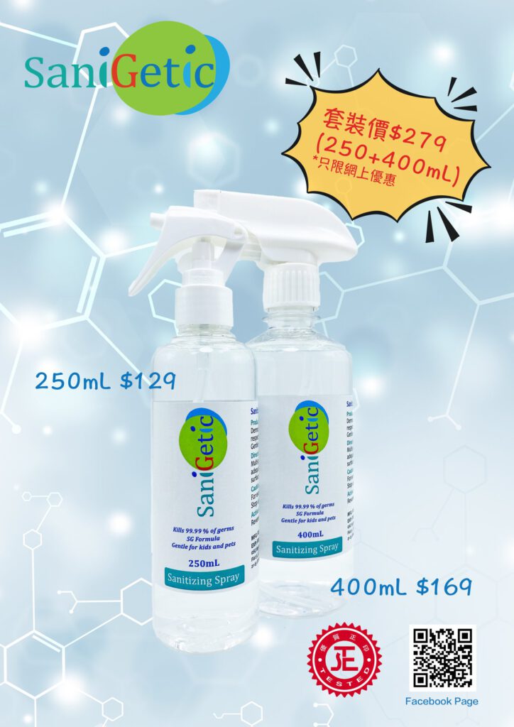SaniGetic抗疫好幫手 家人健康保障嘅最好選擇 立即購物 熱賣產品 Quick ViewSG Sanitizer C01 (30ml) 戶外隨身消毒殺菌噴霧 6支裝 $178.00 Add to cart Quick ViewSG Sanitizer C01 (300ml) 消毒殺菌噴霧 【新年限定】 $169.00 Add to cart Quick ViewSaniGetic 消毒殺菌噴霧 $200.00 Add to cart